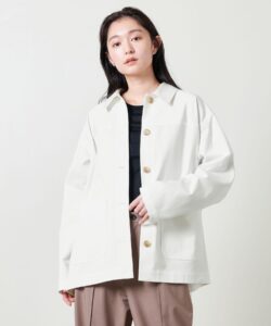 ボクシーなシルエットとス-チング素材がマニッシュな印象ながら、バランスを取ったすっきりめのラペルと金釦が、キレイめにもカジュアルにも広く着回せる一着です。