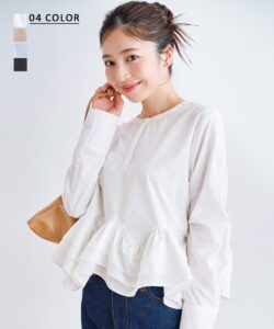 ボタンを開けて重ね着風にも着用できる「釦&タック」、首回りに少しゆとりを持たせたスタンド衿&ギャザーデザインの「ハイネック」、控えめなスタンド衿とフリルが上品なデザインの「フリルネック」、上品な浅めの「Vネック」の4デザインをご用意。
